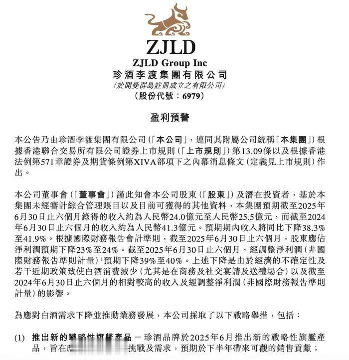 珍酒李渡8月5日晚间发布的2025年上半年业绩预告显示,公司营收预计24亿至25.5亿元,同比下滑38.3%至41.9%;净利润预计下降23%至24%。