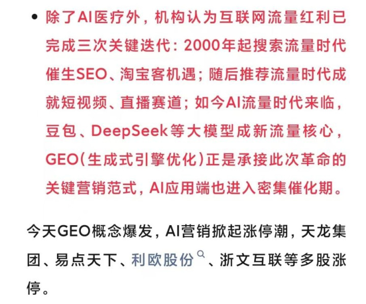 周末的文章有跟大家提过,除了商业航天外,AI应用是最热门的板块,特别是geo概念。我在周五的文章特地写过:机构认为互联网流量红利已完成三次关键迭代:2000年起搜索流量时代催生SEO、淘宝客机遇;随后推荐流量时代成就短视频、直播赛道;如今AI流量时代来临,豆包、DeepSeek等大模型成新流量核心,GEO(生成式引擎优化)正是承接此次革命的关键营销范式,AI应用端也进入密集催化期。